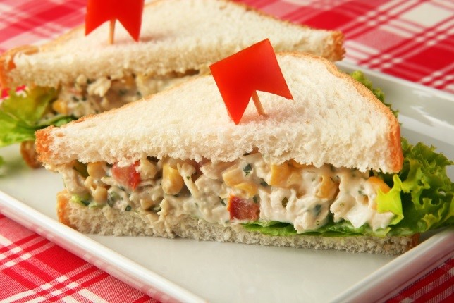 - Para montar os sanduíches, coloque uma folha de alface sobre uma fatia de pão, espalhe uma porção da mistura de frango e cubra com outra fatia de pão.
