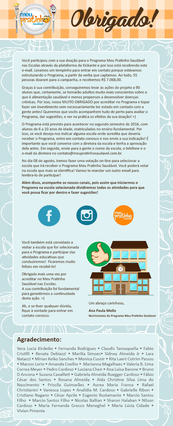 A equipe do Meu Pratinho Saudável irá apresentar um relatório mensal com a execução das atividades, contendo informações sobre a atividade realizada e fotos das equipes na escola. Além disso, divulgaremos as ações nos canais de comunicação do Meu Pratinho Saudável: