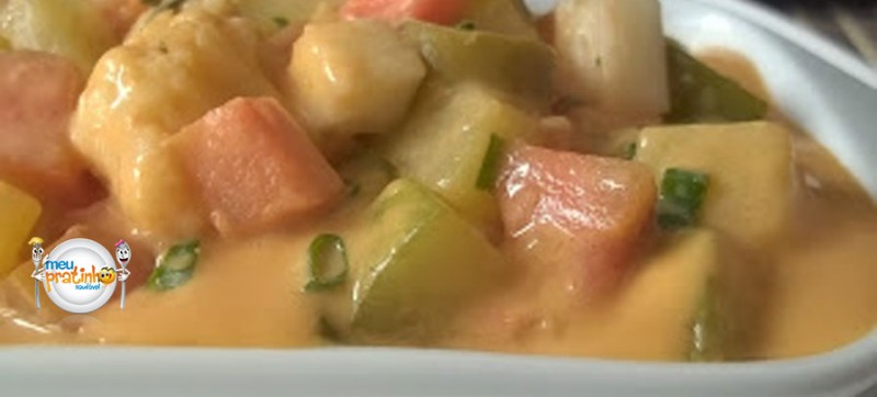 Doure a cebola e o alho no óleo vegetal, junte os vegetais cozidos e o palmito ou o cogumelo (escorrido e picado). Em seguida, adicione os tomates. Ferva por 5 minutos. Adicione por último o creme de leite. Misture bem e antes de servir jogue a salsinha picada. Sirva em seguida.