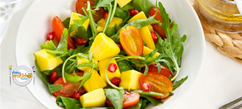Rúcula com agrião, lâminas de manga, tomate-cereja e muçarela de búfala regada com molho de maracujá.